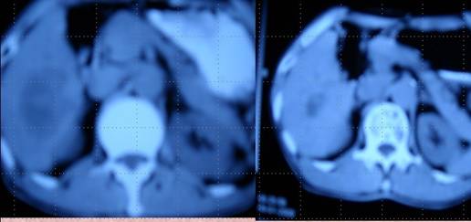 楊XX,男,67歲,退休工人,家住黑龍江雞西市。該患于2008年3月因肝左葉癌在哈爾濱醫科大學二院行肝左葉切除術,術后三個月復查肝CT及MRI示肝右葉轉移,遂于當地礦務局總醫院做了一次血管介入化療栓塞治療。三個月后復查再次出現肝右葉3個轉移灶,其中最大的直徑達5.5cm,又在雞西市中醫院腫瘤科做了一次射頻消融治療。當時只對最大的轉移灶進行了處理,小的沒做處理,患者從確診以來一直在積極求治,結果是一邊治療一邊轉移,最后一次治療結束后,家屬決定讓病人試一試中醫。于是該患者于2008年11月末開始到市中醫院腫瘤科求治與本人,經采用“董氏調胃、強腎、止血、化巖治癌法”治療,患者服藥2個月后復查肝CT及彩超均未提示肝臟有另外兩個小轉移灶,而最大的轉移灶也明顯變小為2.5x3cm,繼續治療三個月復查肝CT及MRI均提示射頻消融術后改變。之后多次復查均為肝左葉切除術后改變,肝右葉射頻消融術后改變;卦L至今患者一切如常,患者已無病生存3年。