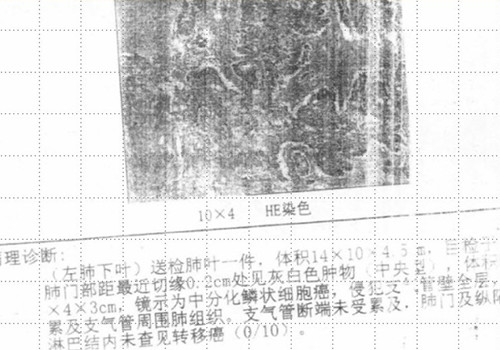 [提要] 患者王某某,男,74歲,于2009年12月在濱州醫學院附屬醫院行左肺下葉占位切除術,術后病理提示為"中分化鱗狀細胞癌"侵犯支氣管壁全層,累及支氣管周圍肺組織。