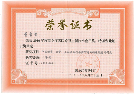 董吉香榮獲2010年度黑龍江省醫(yī)療衛(wèi)生新技術應用獎二等獎。