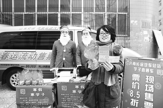 12月23日,濟南長途汽車總站的“春運流動售票車”首站開進了濟南大學(上圖),即日起將陸續開進人流密集的各大商圈、工地、企業等地。