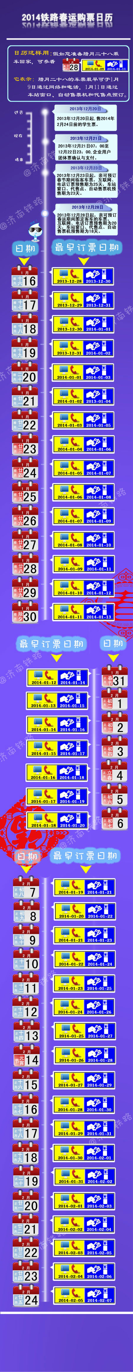 自2013年12月23日起,2014年春運期間臨時加開的旅客列車(以下簡稱臨客)車票預(yù)售期提前,其中互聯(lián)網(wǎng)、電話訂票預(yù)售期為25天,即2013年12月23日發(fā)售2014年1月16日(春運第一天)車票;車站窗口、代售點、自動售票機預(yù)售期為23天,即2013年12月25日發(fā)售2014年1月16日車票。
