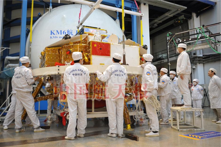 圖為2013年4月,在北京唐家嶺的五院衛星總裝試驗大廳(簡稱AIT大廳)內,五院總裝與環境工程部的試驗人員們正在進行嫦娥三號探測器的熱試驗準備工作,通過本次試驗來最終確認其能否忍受在奔月、落月過程中所要承受的嚴峻考驗。(資料圖)圖片來源:中國航天報