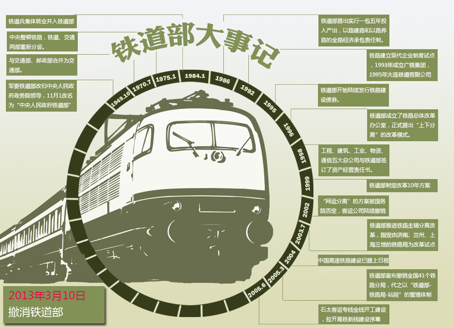 根據(jù)國務(wù)院機構(gòu)改革和職能轉(zhuǎn)變方案,實行鐵路政企分開。將鐵道部擬定鐵路發(fā)展規(guī)劃和政策的行政職責劃入交通運輸部;組建國家鐵路局,由交通運輸部管理,承擔鐵道部的其他行政職責...[詳細]
