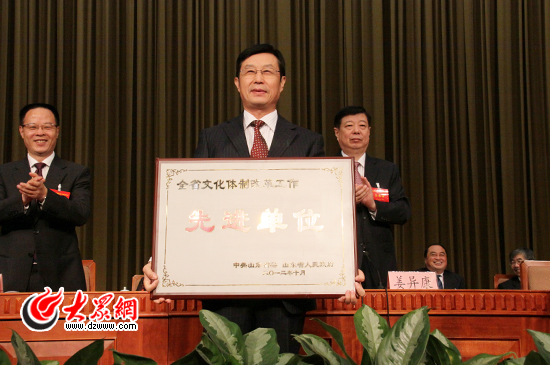 大眾網濟南10月26日訊(記者 盛堃)10月26日,省委省政府在濟南隆重召開全省文化體制改革工作表彰大會。會議深入學習貫徹落實黨的十七屆六中全會和省第十次黨代會精神,傳達全國文化體制改革工作表彰大會和省委常委會議精神,總結黨的十六大以來我省文化體制改革工作,研究部署深化改革、加快發展、推進文化強省建設工作,并以省委省政府名義對全省文化體制改革先進地區、先進單位和先進個人進行了表彰。省委書記、省人大常委會主任姜異康,省委副書記、省長姜大明,省委常委、常務副省長孫偉,省委常委、組織部長高曉兵,省委常委、宣傳部長孫守剛,省委常委、秘書長雷建國,省人大常委會黨組副書記、副主任國家森,副省長張超超,省政協副主席李德強出席會議并為獲獎代表頒獎。