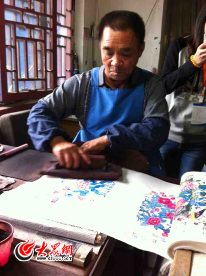 在楊家埠,技師向記者展示木板年畫的上色過(guò)程。記者 張帆 攝