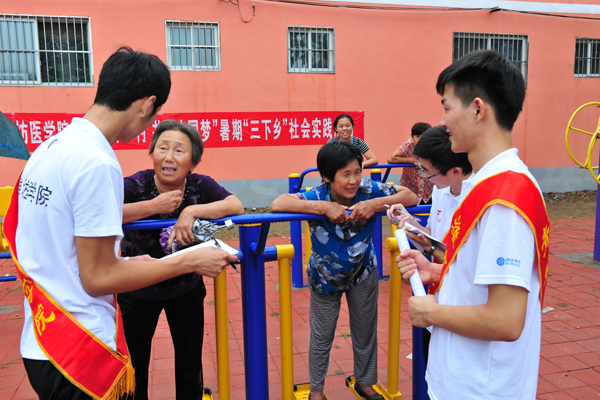 雨后的小村莊,格外清涼。師生們放下行李就忙碌起來,服務(wù)團(tuán)分成五六個(gè)組,各負(fù)其責(zé)。有的去困難黨員和困難農(nóng)戶家中走訪慰問;有的布置舞臺(tái)準(zhǔn)備晚上為村民們獻(xiàn)上精彩的文藝演出;有的協(xié)助醫(yī)療專家開展健康普查和疾病診療服務(wù)。“濰坊醫(yī)學(xué)院大學(xué)生社會(huì)實(shí)踐基地”在兩村掛牌已經(jīng)兩年了,通過基地共建和與“第一書記”幫包村的互動(dòng)合作,濰坊醫(yī)學(xué)院將“三下鄉(xiāng)”變?yōu)椤俺O锣l(xiāng)”,為學(xué)子們走進(jìn)農(nóng)村、了解農(nóng)村、服務(wù)農(nóng)村提供了廣闊舞臺(tái)。