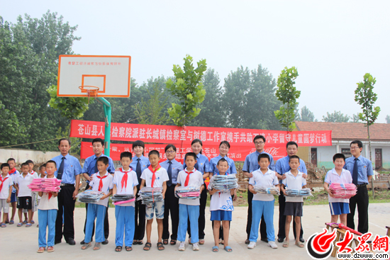7月31日上午8點(diǎn)半,在蒼山縣南橋鎮(zhèn)石埠建源小學(xué)的操場上,掛起了一條鮮紅的橫幅,上面寫著“蒼山縣檢察院駐長城檢察室與樹德工作室關(guān)懷石埠小學(xué)留守兒童行動”。