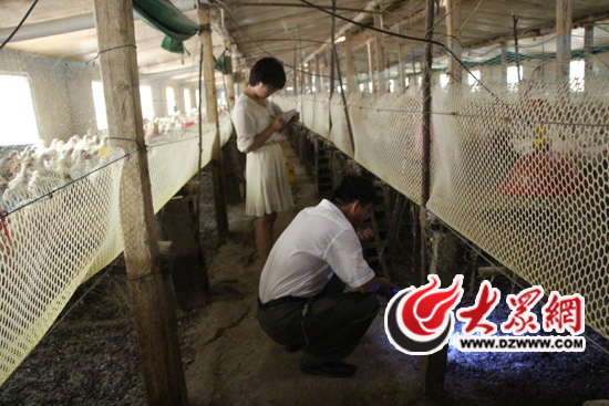 在養雞場,魏祥法查看雞糞,判斷雞的病情