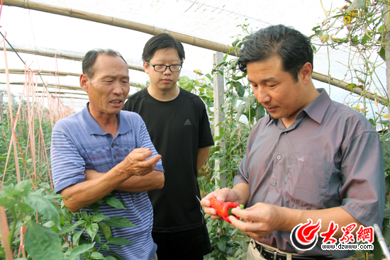 省住房和城鄉建設廳機關黨委副書記、袁家寨村第一書記劉玉富(右),省住房和城鄉建設廳規劃處副主任科員、蘆莊村第一書記喬大山(中)在村民楊廣順的拱棚內查看辣椒收獲情況。記者 姜洋 攝