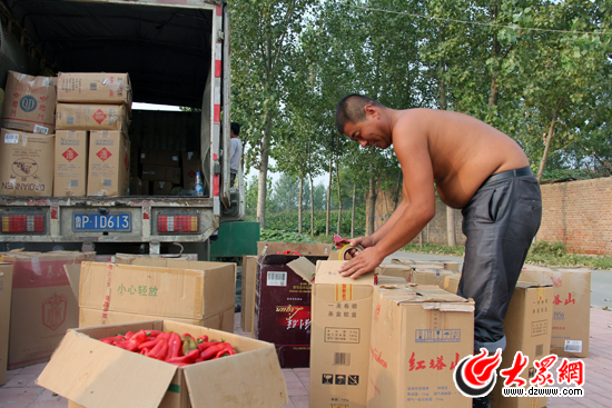 記者在楊光順家的拱棚內看到,1.8畝的地上長滿了紅彤彤的辣椒。在大棚門口,兩個貨車司機正忙著將摘好的熟辣椒搬上車。楊光順告訴記者,今年辣椒銷量不錯,甚至有商販從聊城開車到他家門口收辣椒。