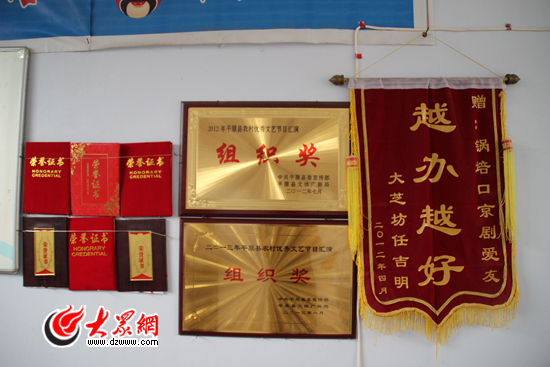腰站鎮(zhèn)鍋培口村的京劇社越辦越好,“草臺班子”拿到的榮譽掛滿了墻。記者 滿志旺 攝