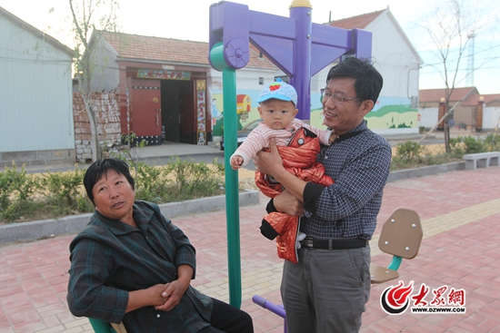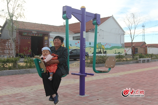 東李村村民丁金榮坐在標準化健身路徑上看孫子