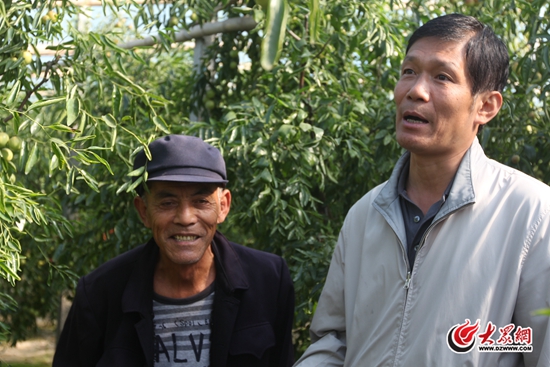 在“第一書記”丁立臣(右)的幫助下,家里有了冬棗大棚,朱榮章(左)大爺高興地合不攏嘴