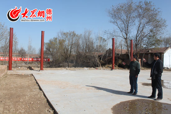 第一書記駐地小院里,幾名村民正在乒乒乓乓敲打著一個鐵架子,一名戴著眼鏡、個頭不高、略顯斯文的中年男子,站在旁邊不斷地和村民們溝通著,這名男子便是丁加軍,鐵架子正是建設中的孔子文化廣場的名字標牌架。
