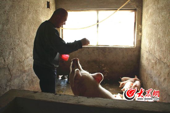 走進西瓦莊村萬永軍家大院的時候,他正和媳婦站在房頂上整理新收獲的玉米。看到大眾網記者,萬永軍從房頂上跳下來,拍拍手上身上的泥土,有些靦腆地與大家打著招呼。他是西瓦莊村遠近聞名的養豬大戶,院子里搭起的豬圈里養著或大或小的豬。