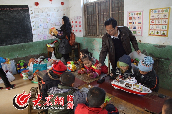 “第一書(shū)記”把青島大學(xué)師生捐贈(zèng)的玩具和圖書(shū)送到孩子們手中。
