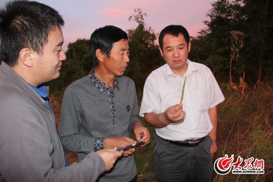 西張村“第一書記”張勇(右)和村書記張青偉(中)向記者介紹蘆筍的生長(zhǎng)條件