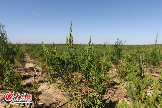 沾化以冬棗聞名全國,但在該縣的大樓鎮(zhèn)韓家糖坊村,卻很少能見到冬棗樹,這里種的最多的是龍柏。9月25日中午,大眾網(wǎng)記者在村里的百畝龍柏示范園前,看到綠油油的龍柏苗一眼望不到邊,而這個當?shù)睾苌僖姷摹跋『蔽铩笔菫I州醫(yī)學院總務(wù)處的副處長——“第一書記”雋博永引進來的“發(fā)財樹”。