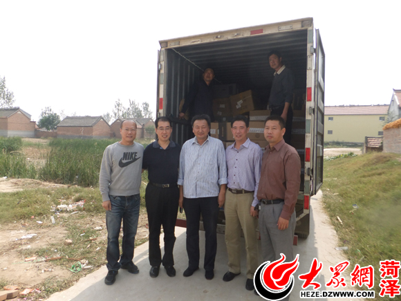 山東師大派駐東明縣菜園集鎮“第一書記”后衙村戰秉聚(右二)、祥寨村譚效忠(左一)等將山東師大二附中捐贈的價值48萬元的112臺液晶電腦送到了后衙村小學