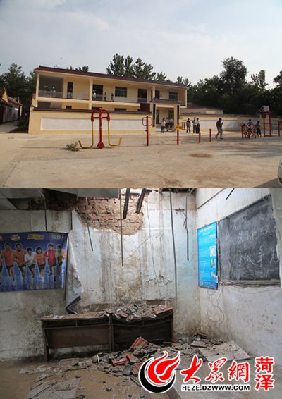 新建成的東田樓村黨員活動室和健身廣場(上)與原先已經坍塌的東田樓黨員活動室內景對比