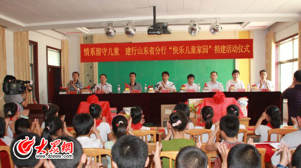 24日上午10點,“情系留守兒童,建行山東省分行‘快樂兒童家園’捐建活動”在聊城市東阿縣魚山鎮中心小學舉行。在活動現場,記者看到貼有“中國建設銀行、大眾網、山東公益愛心捐贈”字樣愛心帖的學生圖書、智力玩具、電腦、電視、乒乓球、足球等物品整齊的擺放在主席臺上,上百名系著紅領巾的留守兒童臉上洋溢著快樂的笑容。“感謝建行沉甸甸的愛,建行山東省分行作為有責任的企業公民,用自己的實踐來回報社會,用他們的無私精神來感染著社會。”大眾網副總經理陳月軍表示,希望建行山東省分行與大眾網一起拼搏,緊密合作,為更多公益事業做出一份貢獻。儀式上,東阿縣組織部副部長楊廣海與建行山東省分行企業文化部長靳曉海共同為“快樂兒童家園”活動室揭牌,魚山鎮中心小學校長李吉廣代表學生們向靳曉海部長贈送了感謝錦旗。在活動現場,來自孩子們的感謝掌聲不斷響起。