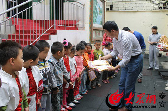 “第一書記”郭占祿、王振宇走進社區(qū)學校給孩子們送禮物。(記者 張冉 攝影報道)