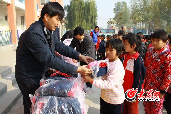 來自省食品藥品監(jiān)督管理局的“第一書記”王洪坤向柿園小學(xué)的孩子們送上了校服。記者 張帆 攝