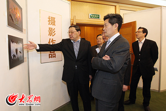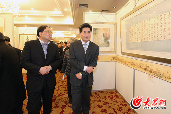 大眾報業集團黨委書記、董事長、總編輯傅紹萬在書畫作品前駐足觀看 楊春衛 攝