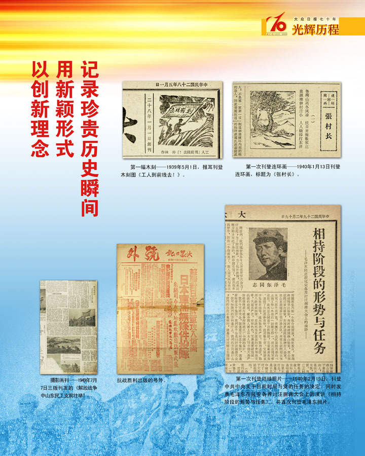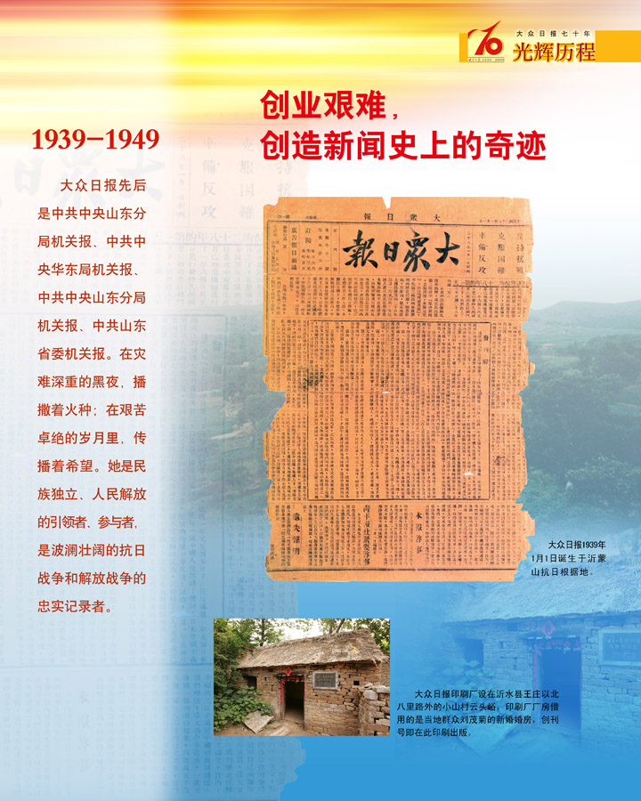 1939年創刊,大眾日報為中共中央山東分局機關報。 1945年,中共中央華東局成立,大眾日報改為中共中央華東局機關報。 1949年3月,中共中央華東局南下,中共中央山東分局成立,大眾日報改為中共中央山東分局機關報,并于1949年4月1日由解放區農村遷至濟南出版,同時為中共濟南市委機關報。 1954年8月,中共中央山東分局撤銷,成立中共山東省委員會,大眾日報改為中共山東省委機關報至今。