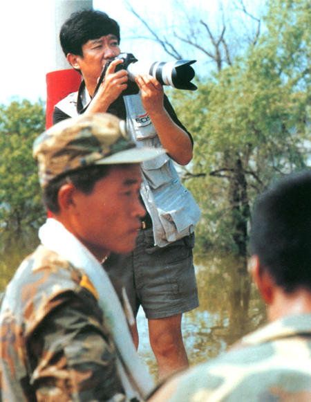 記者在抗洪搶險前線采訪