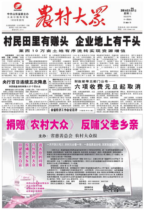 農村大眾報始終定位于服務農業、農村、農民,以“黨報的權威,生活報的趣味,科技報的信息,專業報的嚴謹”為主旨,大膽創新,策劃實施了一系列重大的新聞報道及公益活動,發揮了“指導全省農村工作重要輿論陣地”的作用,被譽為農民朋友的政策手冊、致富向導、科技寶典、生活益友。目前,發行量20萬份,在全國農村報陣營中,已經形成“南有南方農村報,北有農村大眾報”的南北雙雄格局,是“全國優秀三農媒體”,聯合國教科文組織登記注冊的兩家山東報紙之一。