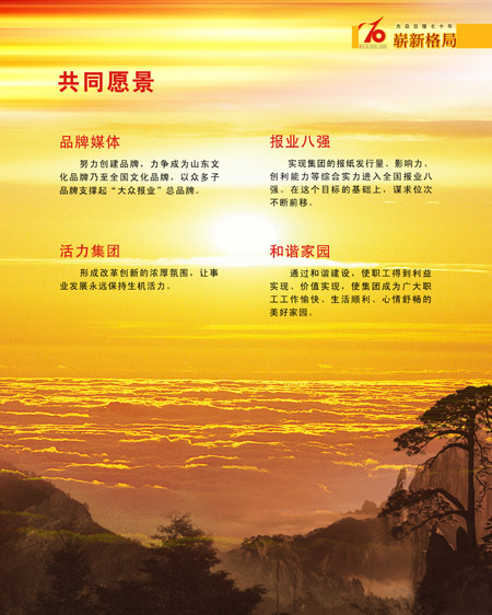 “品牌媒體、報業八強,活力集團、和諧家園”這十六個字的共同愿景,是全體大眾報人站在70年歷史基石上面向未來的展望。要用這個愿景凝聚職工的精神和力量,共同努力,用三年左右時間,實現這個愿景。