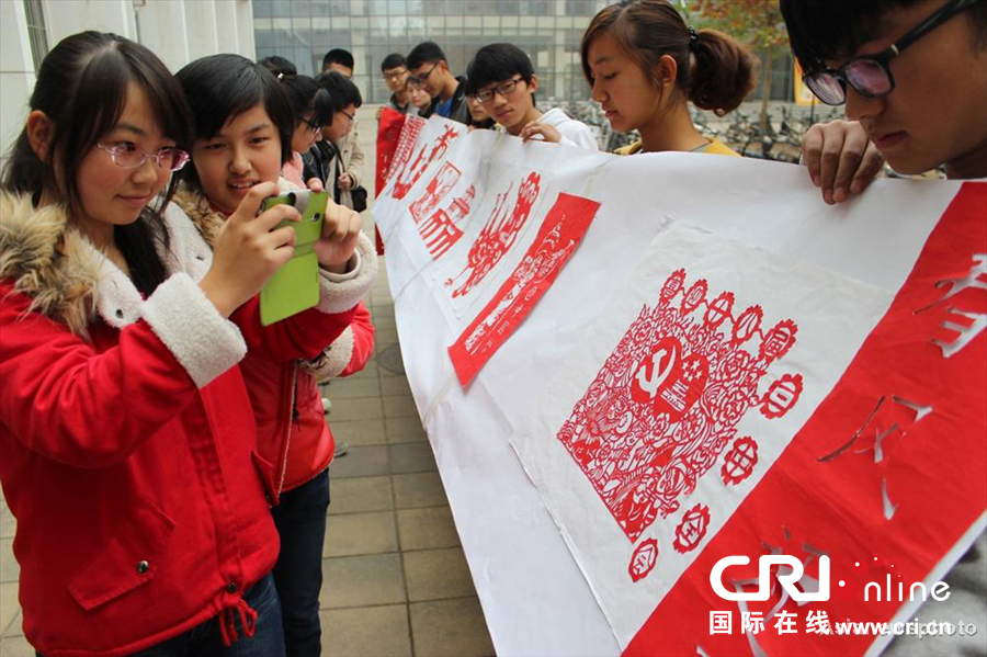 11月9日,在山東聊城大學,大學生志愿者們在展示創作的剪紙作品,以慶祝黨的十八屆三中全會的召開。