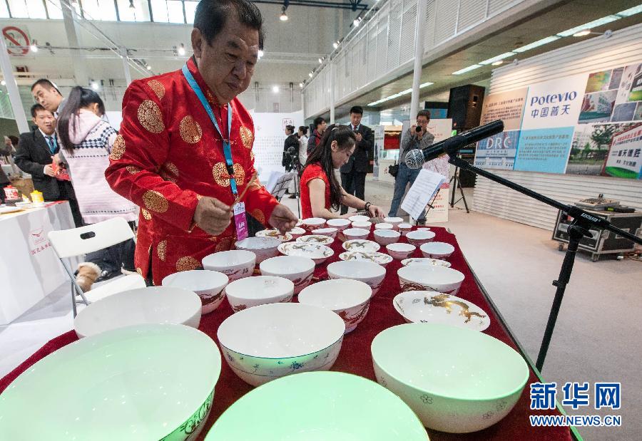 參加第八屆中國北京國際文化創意產業博覽會的人員在文博會上用瓷碗演奏樂曲(2013年11月7日攝)。