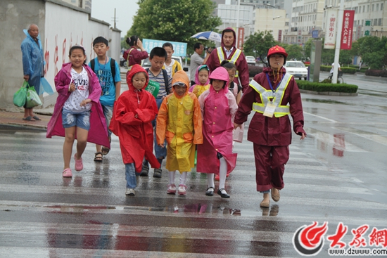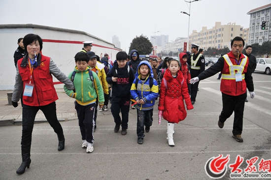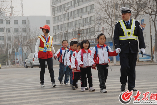 2012年3月1日,山東省日照市新營小學路口,汪麗麗(左一)和丈夫鄧立剛(右一)護送學生過馬路!