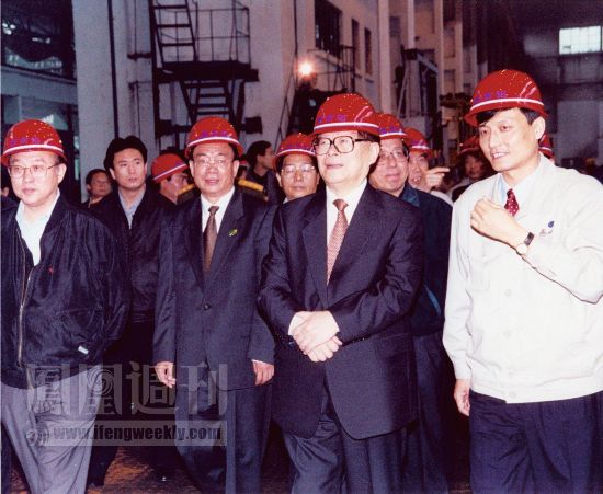 圖:2002年5月22日,時任重慶市委書記的賀國強陪同江澤民同志視察西南鋁廠。
