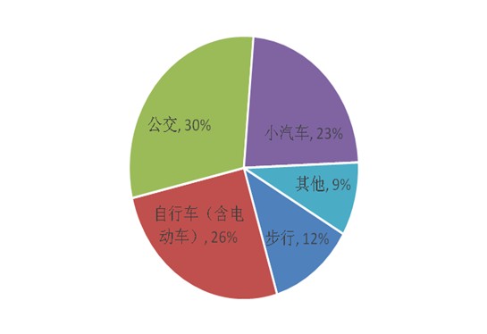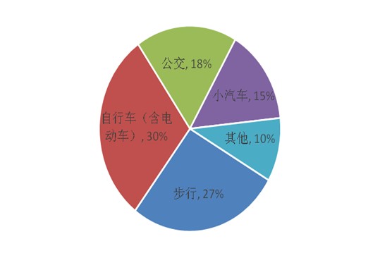 調查結果顯示,正常工作日內,居民主要的交通出行方式依次為步行、自行車、公共交通、小汽車、其他。周末與周一的出行方式結構形態基本相同,依次為公交車、小汽車、電動車、自行車、步行、其他。其中,周末的公交車、小汽車的出行比例比工作日較高。