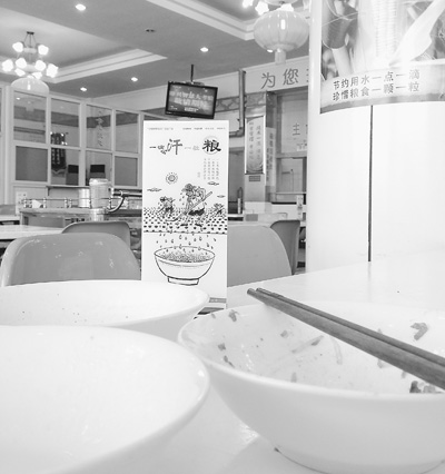 找到座位后,記者最先被桌上的一個宣傳牌吸引,宣傳牌上是一幅由河北邱縣農(nóng)民漫畫家創(chuàng)作的漫畫,畫中兩位農(nóng)民在烈日下勞作,漫畫旁邊配了一首名為《一滴汗一粒糧》的小詩:“一日不吃餓得慌,一季不吃餓斷腸,手拍胸膛想一想,節(jié)約糧食理應當!贝送狻胺磳速M”“光盤行動”“節(jié)約用水”等宣傳語和宣傳畫也隨處可見。