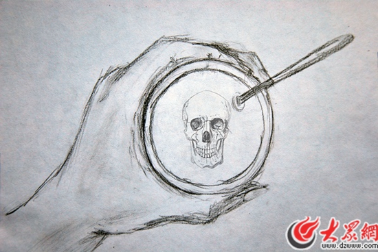 粗狂的線條描繪了有力的手掌,握緊水杯,此時杯中的倒影不是自己的面孔卻是代表邪惡的骷髏頭。警惕世人不要被欲望所害。
