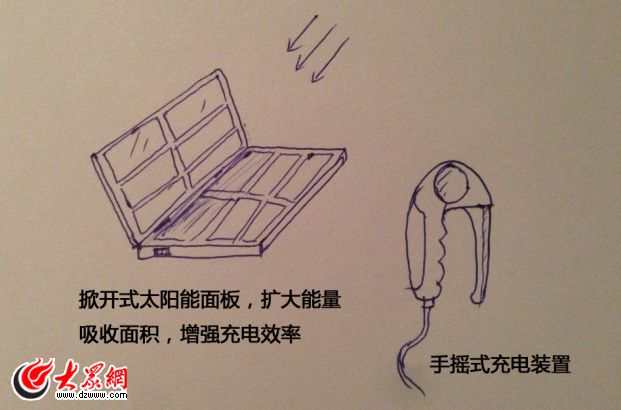 目前市面上的移動電源,本身需要接數據線充電,而本產品面板自帶太陽能面板,可隨時為移動電源充電,另外還有小型手搖外接充電裝置,在沒有任何外部電力的情況下可手動為移動電源充電,是一款適合戶外運動的新型移動電源產品。當然,在正常有電環(huán)境時,該產品也可使用常規(guī)的充電接口進行充電。
