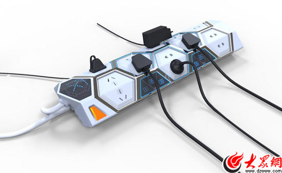 設(shè)計說明:蜂巢是六邊形模塊組合,多種拼接方式,具有強大的相互聯(lián)系性。設(shè)計以蜂巢形態(tài)為切入點,利用基本六邊形模塊,完成模塊之間的多種拼接擴展與多程控制。六邊形模塊的立體拼接是插頭擁擠問題得以解決,電量統(tǒng)計使用電量化。模塊化設(shè)計試生產(chǎn)使用更加自由,增強插排的適應(yīng)性與宜人性。