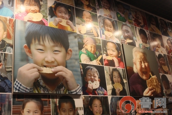 周村燒餅博物館內(nèi)通往燒餅制作區(qū)的電梯兩側,掛滿了百余幅游客吃燒餅的歡樂笑臉。