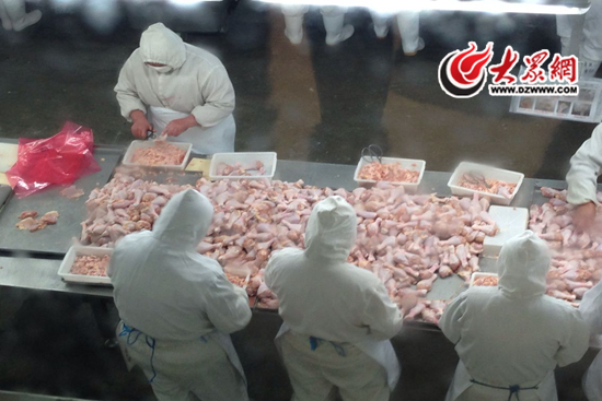工人們正在車間里把雞腿修剪成標準形狀。 大眾網(wǎng)記者 劉明明 攝