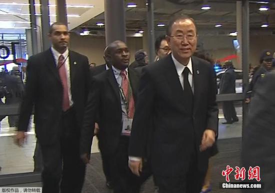 當地時間12月10日,聯合國秘書長潘基文抵達南非FNB體育場,出席南非前總統曼德拉的官方追悼會。