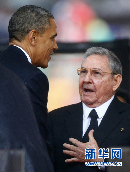據(jù)悉,在曼德拉追悼大會(huì)上,奧巴馬在登臺(tái)致辭前與出席追悼大會(huì)的外國(guó)領(lǐng)導(dǎo)人打招呼。當(dāng)走到卡斯特羅面前時(shí),奧巴馬伸出手去,兩人握了手。