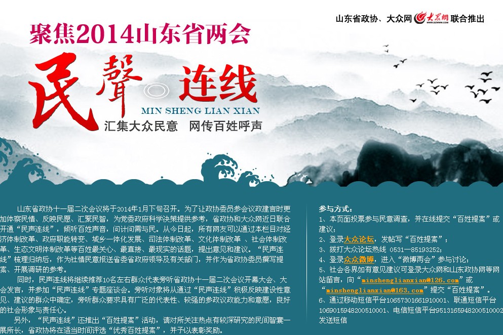 從今天起,網友可登陸省政協和大眾網聯合開通的“民聲連線”欄目(http://www.gaoxiaozai.com/2013/msrx/),參與大眾網推出的大型民意調查,并在山東經濟、政治、文化、社會和生態文明體制改革以及現代市場體系完善、政府職能轉變、城鄉一體化發展、自由貿易區建設等最直接、最現實的話題板塊中,投票選擇你最關心的問題。