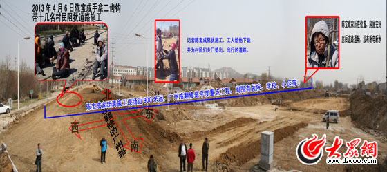大眾網(wǎng)記者調(diào)查了解到,這張照片背后真相為,2013年4月6日上午8時,陳寶成帶領(lǐng)十幾位村民在村西口,手拿二齒釘耙、鐵锨等農(nóng)具,阻擾正在施工的廣州路,而此路段距離陳寶成和其他拒拆戶家都有幾百米的距離,距陳寶成家近900米遠(yuǎn)。