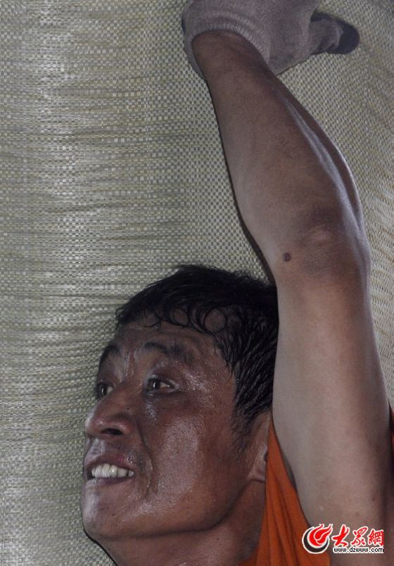 9點半,工人們已經全力以赴工作了3個小時,此時,8月份的青島已有30℃的高溫,碼頭上的地表溫度更達40℃左右。在火車車廂內,一名高個工人吸引了記者的注意力,他高高瘦瘦,戴著眼鏡,顯得很斯文,從外表看,并不能與裝卸工人聯系在一起,因為他的體重遠不及肩膀上的麻包。但從表情來看,80公斤的重量對他來說,并不是很重。這名濰坊籍小伙今年25歲,已經在港口工作了三年,一個班可以和工友們一起裝卸7部半掛車。