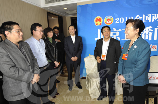 大眾網(wǎng)總編輯朱德泉向翟魯寧介紹大眾網(wǎng)2013全國(guó)兩會(huì)專題。(特派記者 盛堃 攝)