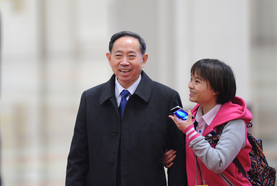 3月15日上午9時,十二屆全國人大一次會議在人民大會堂舉行第五次全體會議,決定國務院總理的人選;決定中華人民共和國中央軍事委員會副主席、委員的人選;選舉最高人民法院院長;選舉最高人民檢察院檢察長。圖為大會開幕前教育部部長袁貴仁在記者的“追纏”下步入會場。 新華網/中國政府網 陳競超 攝